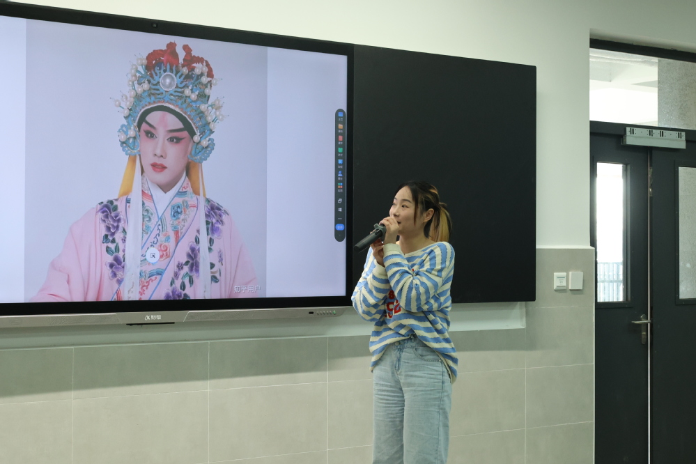 活动伊始,杨晨晨老师以“京剧是什么”为引,向同学们介绍了京剧的基本知识,从生旦净丑四大行当,到“唱念做打”四功五法,通过生动讲解与亲身示范,将京剧的技艺体系娓娓道来,结合自身工武旦的表演经验,她重点展示了“手眼身法步”的程式之美与写意之韵,让同学们在理论与形象的结合中,领略到京剧表演的独特魅力。