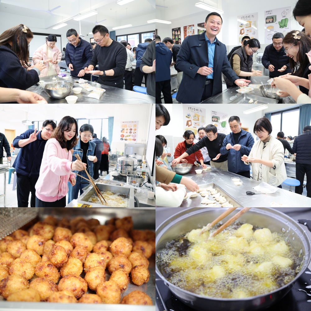 活动现场,老师们各展所长、默契协作:有人在桌前,指尖翻飞间,一个个饱满的饺子整齐码在托盘之上;有人系上围裙,手戴隔热手套,从烤箱端出滋滋冒香的烤鸡翅;有人专注油锅前,炸制出色泽金黄、外酥里嫩的圆子与香蕉。奶茶的醇厚、烤肉的焦香、饺子的温热,交织成最温暖的“家的味道”。