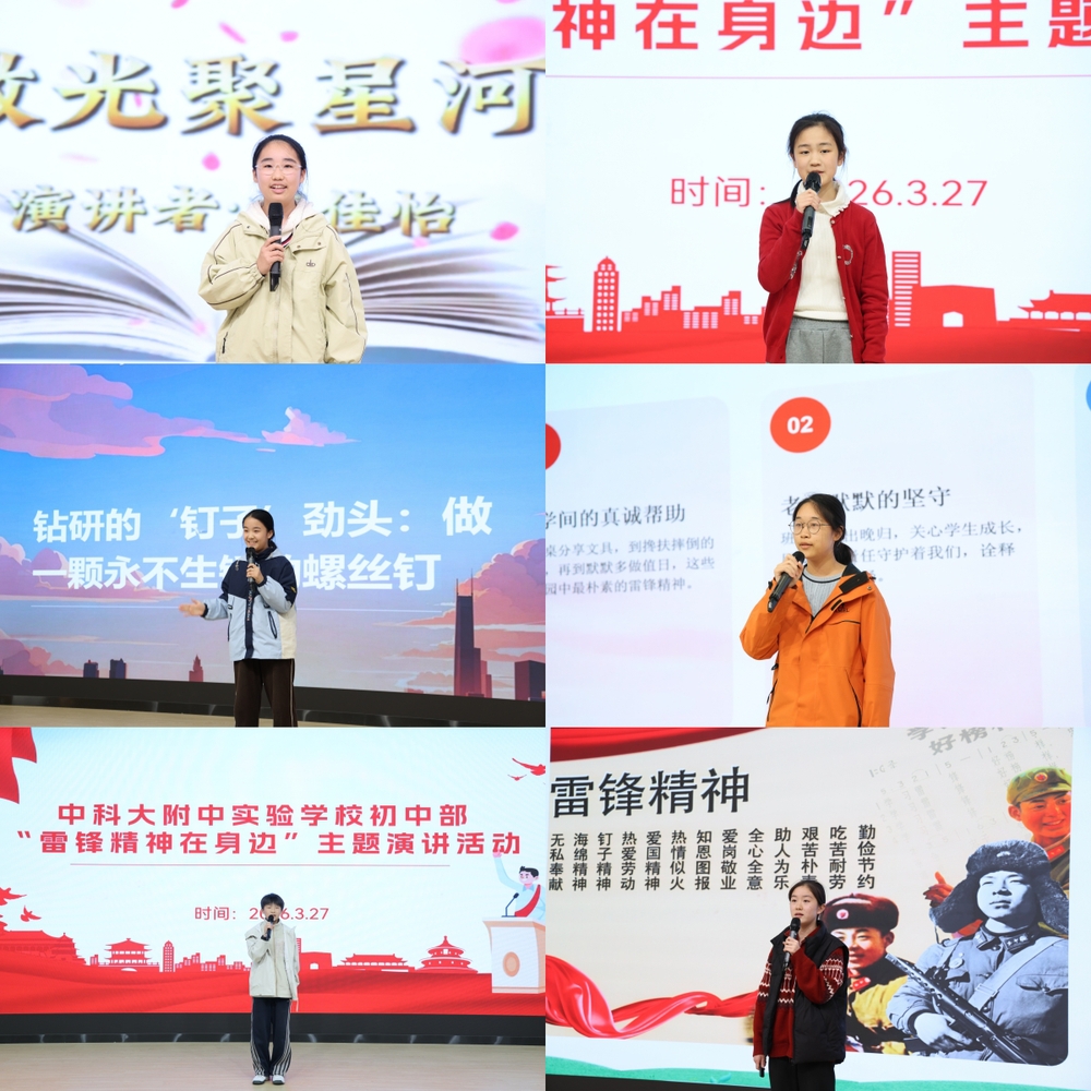 七年级的选手们同样表现亮眼,单思妍同学以《红枫映初心,雷锋精神在身边》为题,将校园里的互助小事与雷锋精神紧密结合,细腻的讲述打动了在场每一位观众;苏佳怡、张姝粲同学分别带来《微光聚星河》《雷锋精神在身边》,用质朴的语言展现少年们对奉献的理解;陈子续、刘婉清、谢君谦、何佳忆同学也各展风采,从不同角度解读雷锋精神,传递向上向善的力量。
