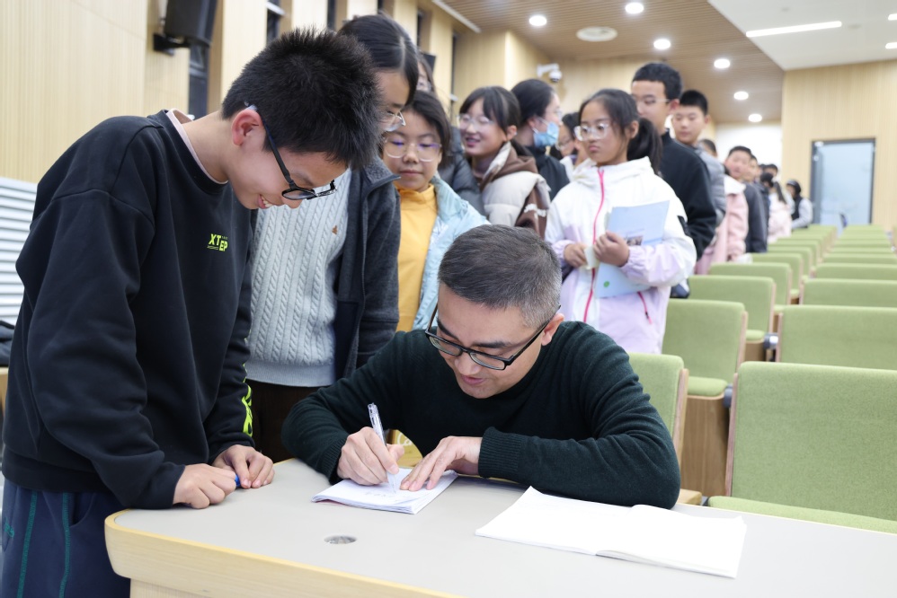 整场讲座在师生们热烈的互动中落下帷幕。活动尾声,教务处副主任张国平代表学校向黄建颁发纪念奖章。