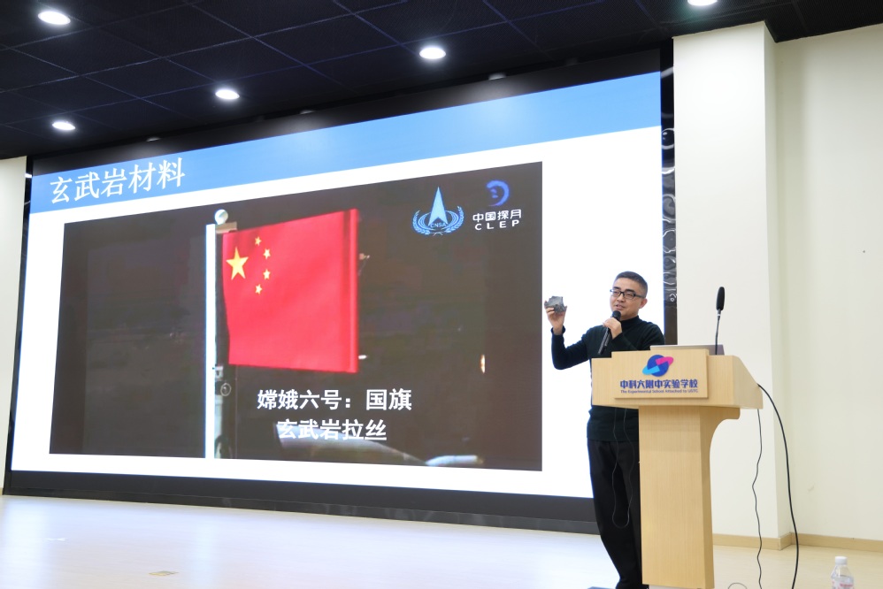 令人惊喜的是,毁灭往往与创造相伴相生。黄建用丰富的实例展示了海底火山作为“宝藏孕育者”的另一面。火山喷发造就了独特的旅游资源;地热能源为人类提供了清洁电力与取暖方式;更令人惊叹的是,火山岩在多个尖端领域大放异彩——“嫦娥六号”探测器上的国旗,正是由玄武岩这一火山材料拉丝制成。此外,海底热液区还孕育了不依赖阳光的奇特生态系统,为科学探索提供了无限可能。从“灾难制造机”到“宝藏孕育者”的转折,同学们不禁发出了阵阵惊叹。当听到“嫦娥六号”国旗的材料竟源自火山时,颠覆了同学们对火山资源与航天科技的固有认知,现场气氛达到高潮。