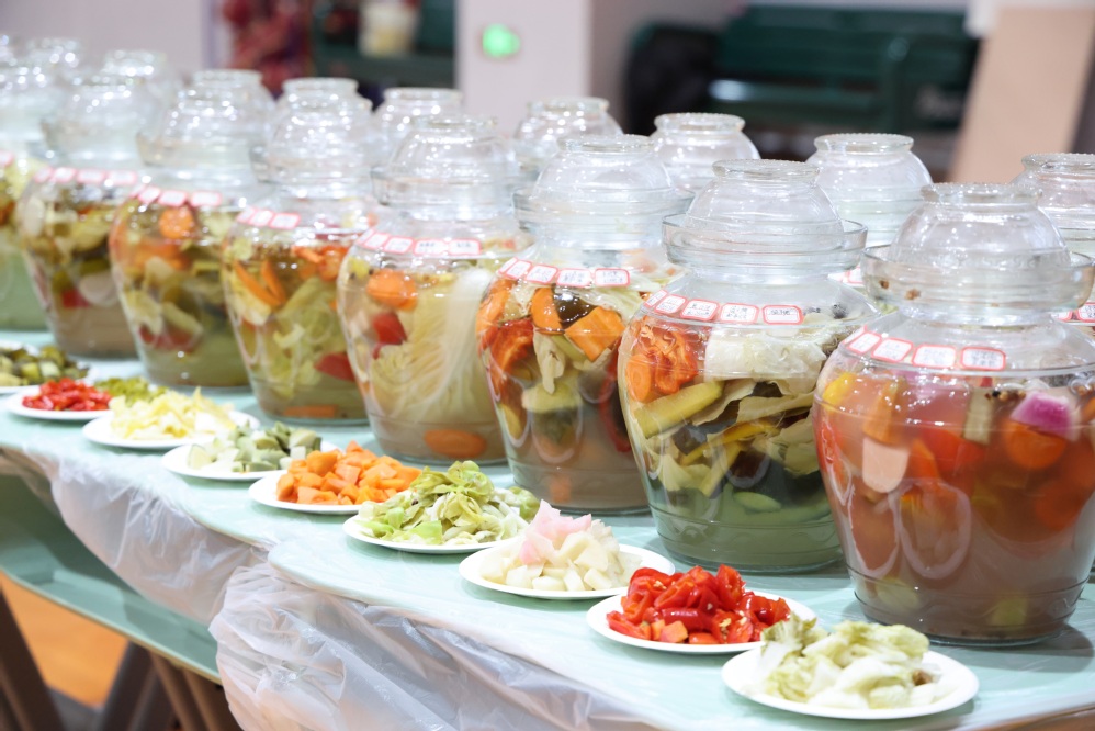走进篮球馆,仿佛踏入了一条香气四溢的美食长廊。入门第一个摊位便让人眼前一亮——七年级各班的劳动小组展示了亲手制作的泡菜,酸甜脆爽,蕴含着劳动的智慧。